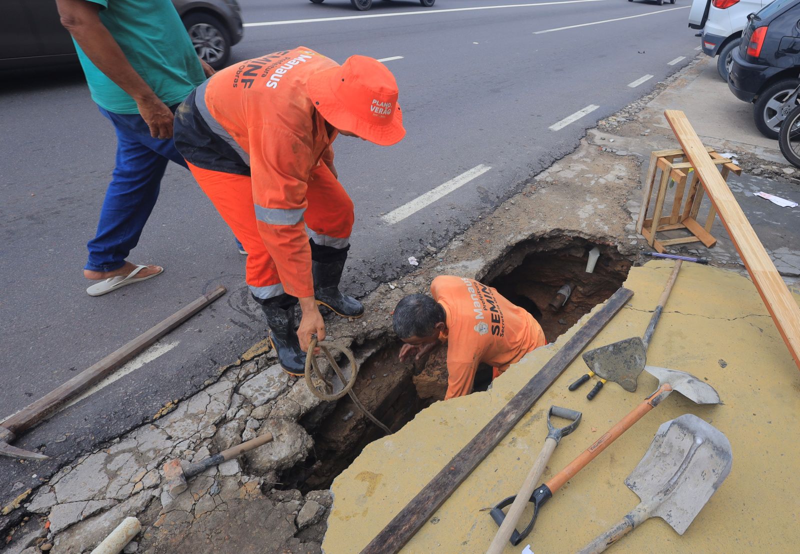 Prefeitura de Manaus executa reparo urgente em cratera que comprometeu uma das principais vias da zona Centro-Sul. Descarte irregular de lixo causou o problema