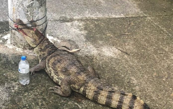 Manaus (AM) – Um jacaré foi encontrado amarrado a um poste, na manhã desta terça-feira (16), no Passeio do Mindu, no bairro Parque Dez, zona Centro-Sul de Manaus. Preso com fios elétricos, o animal apresentava ferimentos na cabeça e na boca.