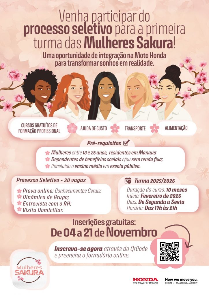 Manaus, 04 de novembro de 2025 – Como parte das ações comemorativas pelos 50 anos de produção da Moto Honda no Brasil em 2026, a empresa lança o projeto social Mulheres Sakura, voltado ao desenvolvimento pessoal e profissional de mulheres residentes em Manaus. A iniciativa reforça o compromisso da Honda com o fortalecimento das comunidades onde está presente.