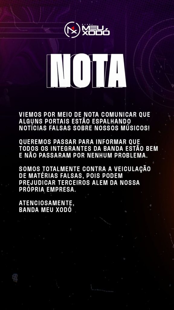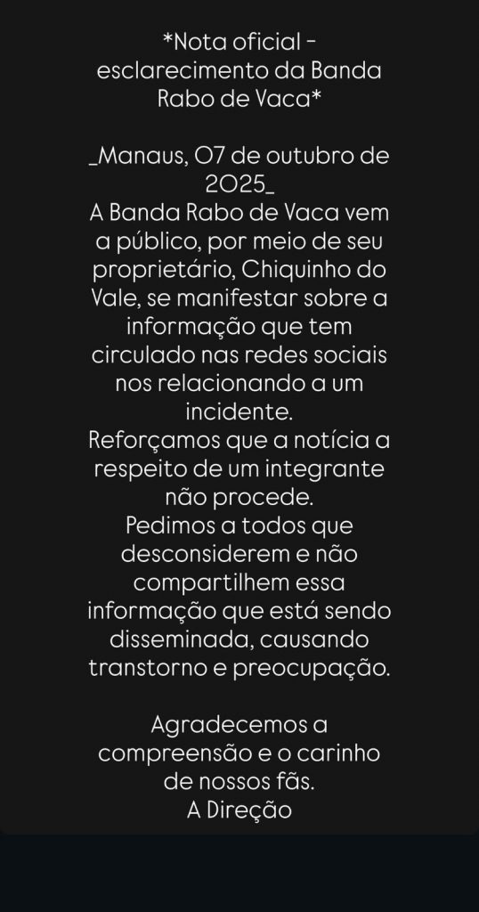 Manaus (AM) – As bandas Rabo de Vaca e Meu Xodó vieram a público nesta terça-feira (7) para desmentir informações falsas que circularam nas redes sociais sobre o atentado ocorrido na zona Leste de Manaus.