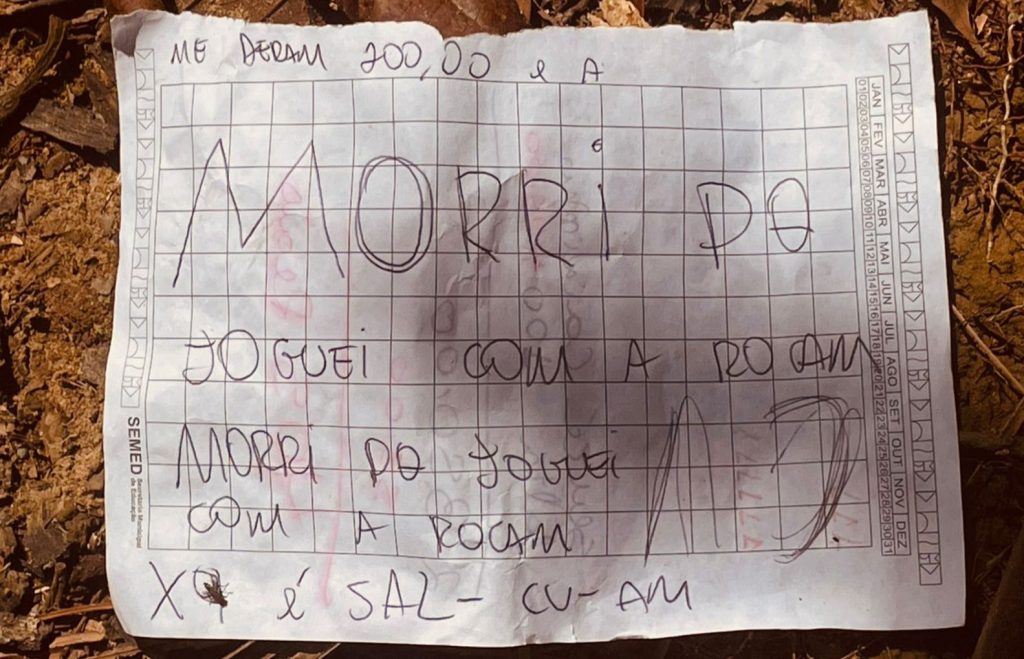 O bilhete dizia: “Morri porque joguei com a Rocam. X-9 é sal”, seguido da frase “Me deram R$ 200”.