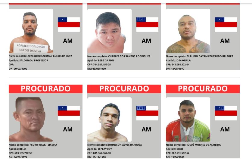 Oito criminosos do Amazonas foram incluídos na lista dos 216 foragidos mais procurados do Brasil. Os nomes aparecem no site gov.br/captura, lançado pelo Ministério da Justiça e Segurança Pública (MJSP) na segunda-feira (8). A ferramenta centraliza informações para facilitar a identificação, o rastreamento e a prisão de criminosos de alta periculosidade.