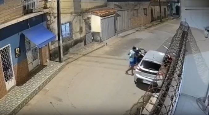 Imagens de câmeras de segurança flagraram o momento em que os suspeitos se aproximam correndo e cercam o veículo. Em pânico, a mulher e a criança começam a gritar, chamando a atenção de moradores da região.