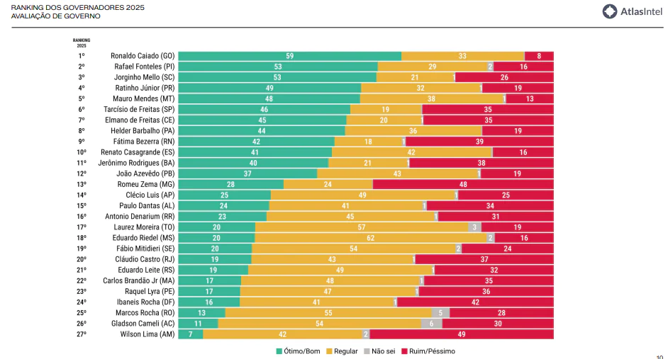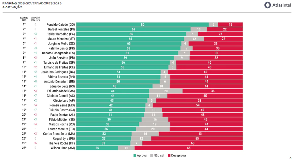 A mesma pesquisa indica que o governador de Goiás, Ronaldo Caiado (União Brasil), lidera o ranking nacional de aprovação, com índice próximo a 80% entre os eleitores do estado.